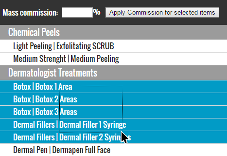 Type the commission into each treatment/product’s commission input (scroll down to see all the list) and then press the “Save changes” button from the top right section.